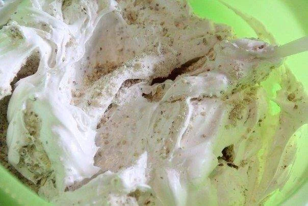 Transfer the protein mass to a bowl of nut-flour mixture. Using a silicone spatula, gently stir the whites with flour. Do not stir for a long time, otherwise the proteins will settle.